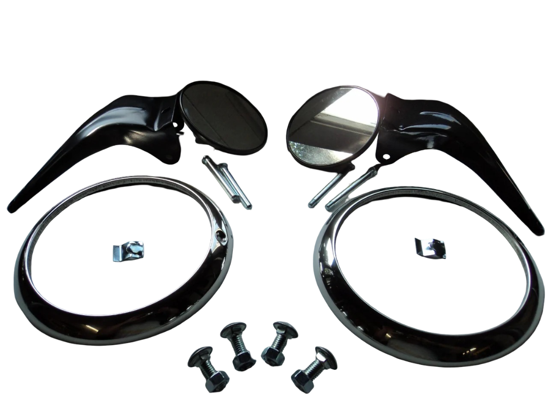 This is a package of reproduction exterior body parts for B-series Dodge trucks built between 1948 and 1953. Package includes 2 headlight rings (T38A), B-series hinge pin set (T493), 1 pair of mirror arms for B-series trucks (T499), 2 black mirror heads (T20), and 4 rear bumper bolts (T437).