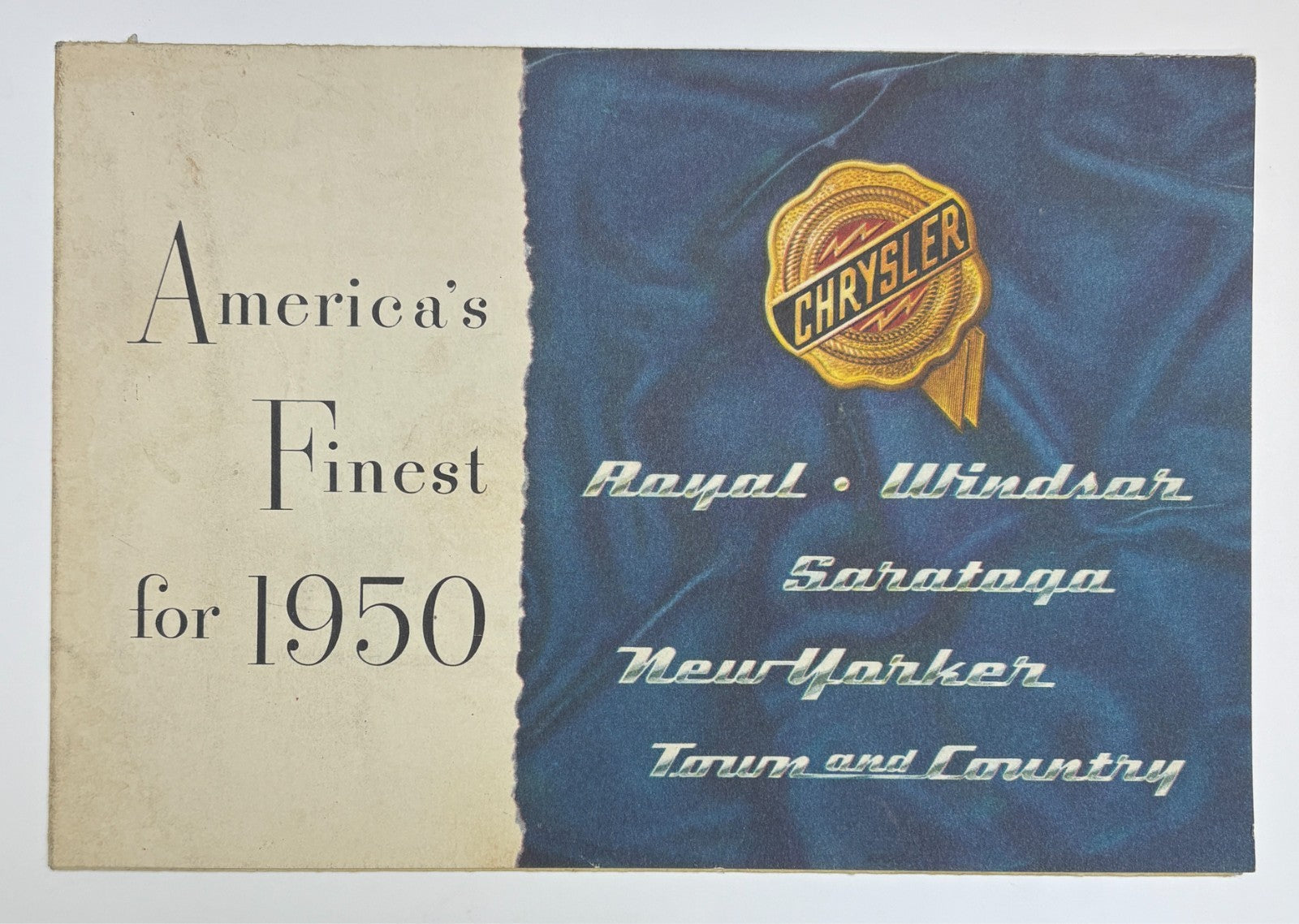 This is a 1950 Chrysler dealer sales brochure featuring "America's Finest for 1950" theme with elegant prestige styling and premium presentation. Original factory literature showcasing the complete Chrysler lineup including Royal, Windsor, Saratoga, New Yorker, and Town and Country models with period luxury styling and specifications.