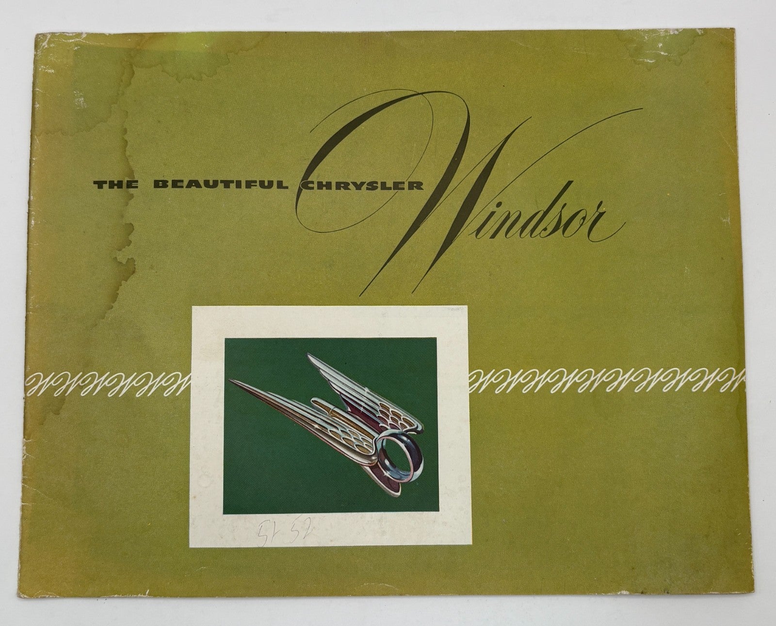 This is a 1951-52 Chrysler Windsor sales brochure featuring "The Beautiful Chrysler Windsor" with elegant script typography and distinctive hood ornament imagery on olive green background. Original dealer literature representing Windsor's position as Chrysler's entry-level luxury car during the early 1950s automotive prosperity era.