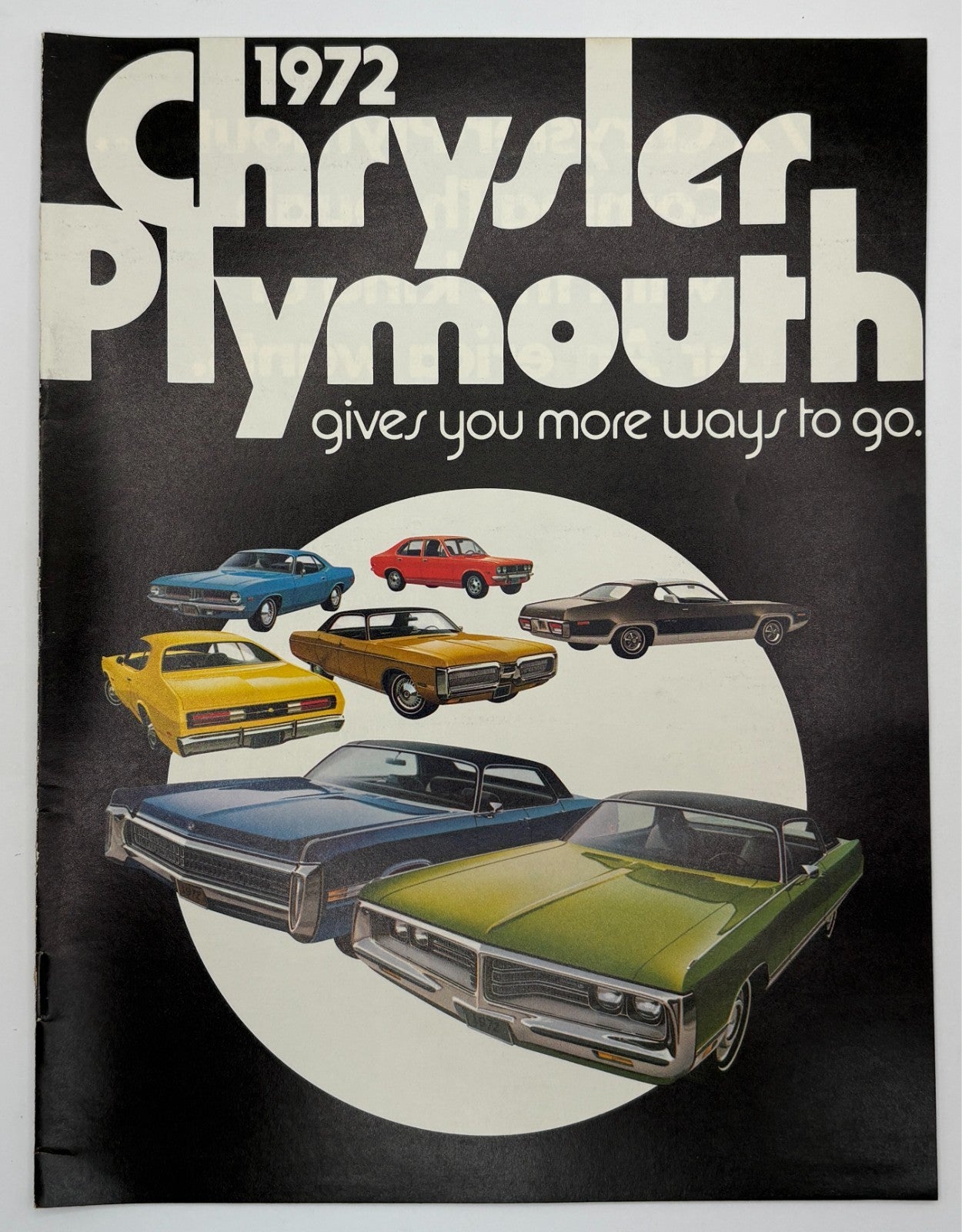 This is a 1972 Chrysler Plymouth master sales brochure featuring "gives you more ways to go." tagline with comprehensive coverage of the complete model lineup during the peak muscle car era. Original factory literature showcasing the full range with modern graphic design reflecting the diversity of the Chrysler-Plymouth family.