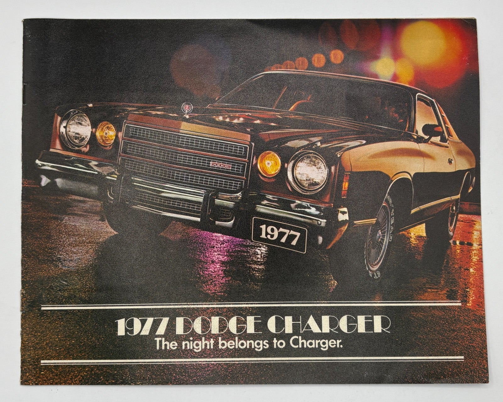 This is a 1977 Dodge Charger sales brochure featuring "The night belongs to Charger" with dramatic nighttime photography and atmospheric lighting effects. Original dealer literature representing the final year of second-generation Charger styling during the peak era of 1970s performance car marketing.