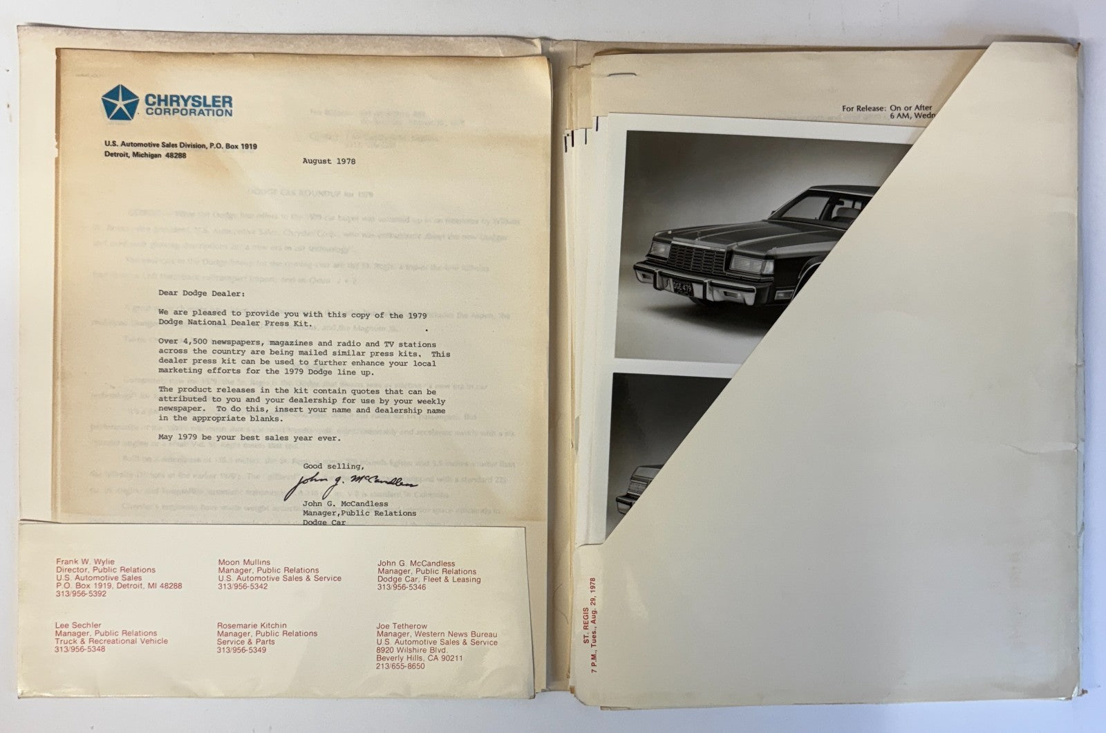 This is a 1979 Dodge Press Info folder featuring comprehensive dealer press kit materials designed for TV stations and local marketing efforts. Original Chrysler Corporation U.S. Automotive Sales Division documentation dated August 1978, including signed dealer letter from John G. McCandless during the critical corporate survival year when Chrysler fought for survival under Lee Iacocca's leadership.