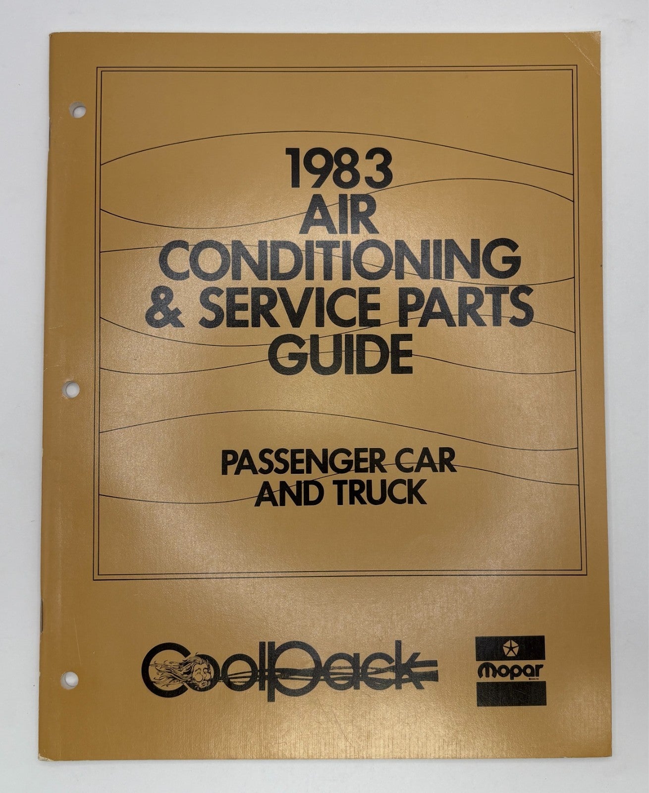 This is a 1983 Chrysler "Air Conditioning & Service Parts Guide" for passenger cars and trucks featuring CoolPack branding and comprehensive A/C service information. Original dealer literature providing technical specifications and parts identification for professional service department use during the peak traditional A/C era.