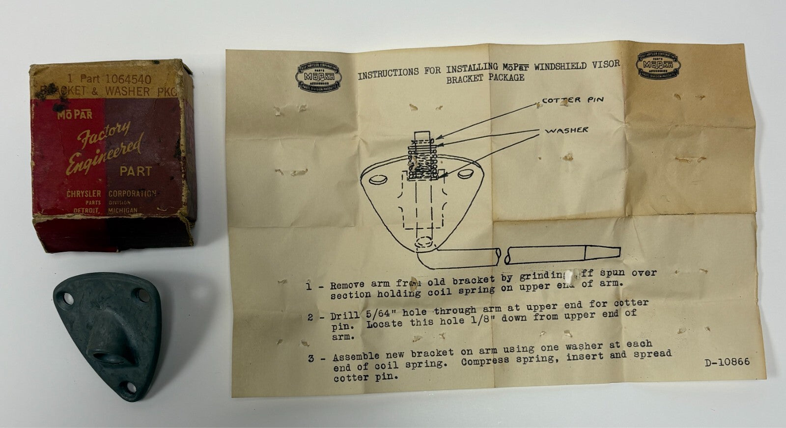This is a new old stock sun visor bracket for the listed models. New Old Stock Mopar part in its original packaging.