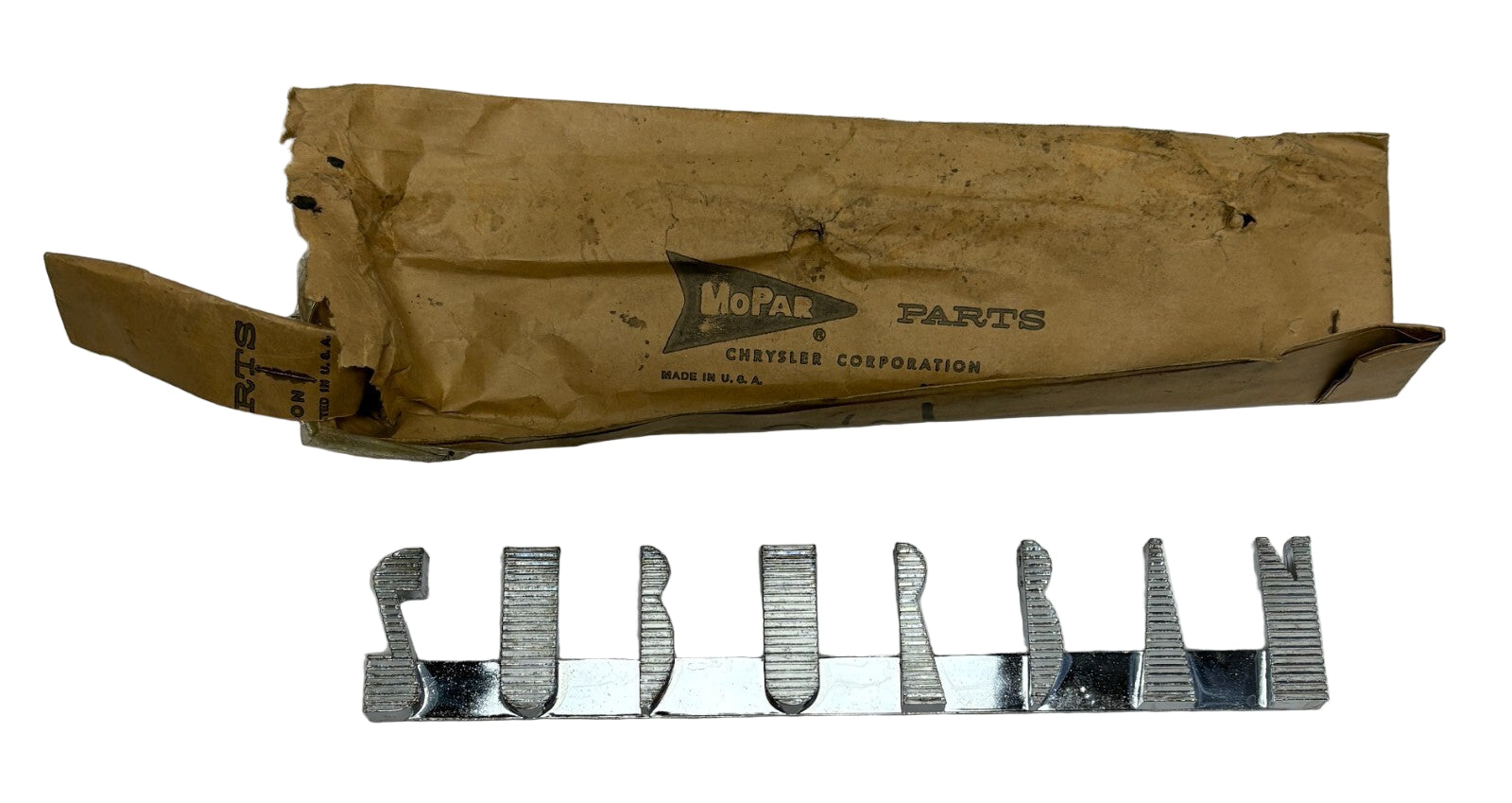 Suburban Name Plate - This is a New Old Stock Suburban name plate for the models listed below. Original Mopar part in original packaging.
