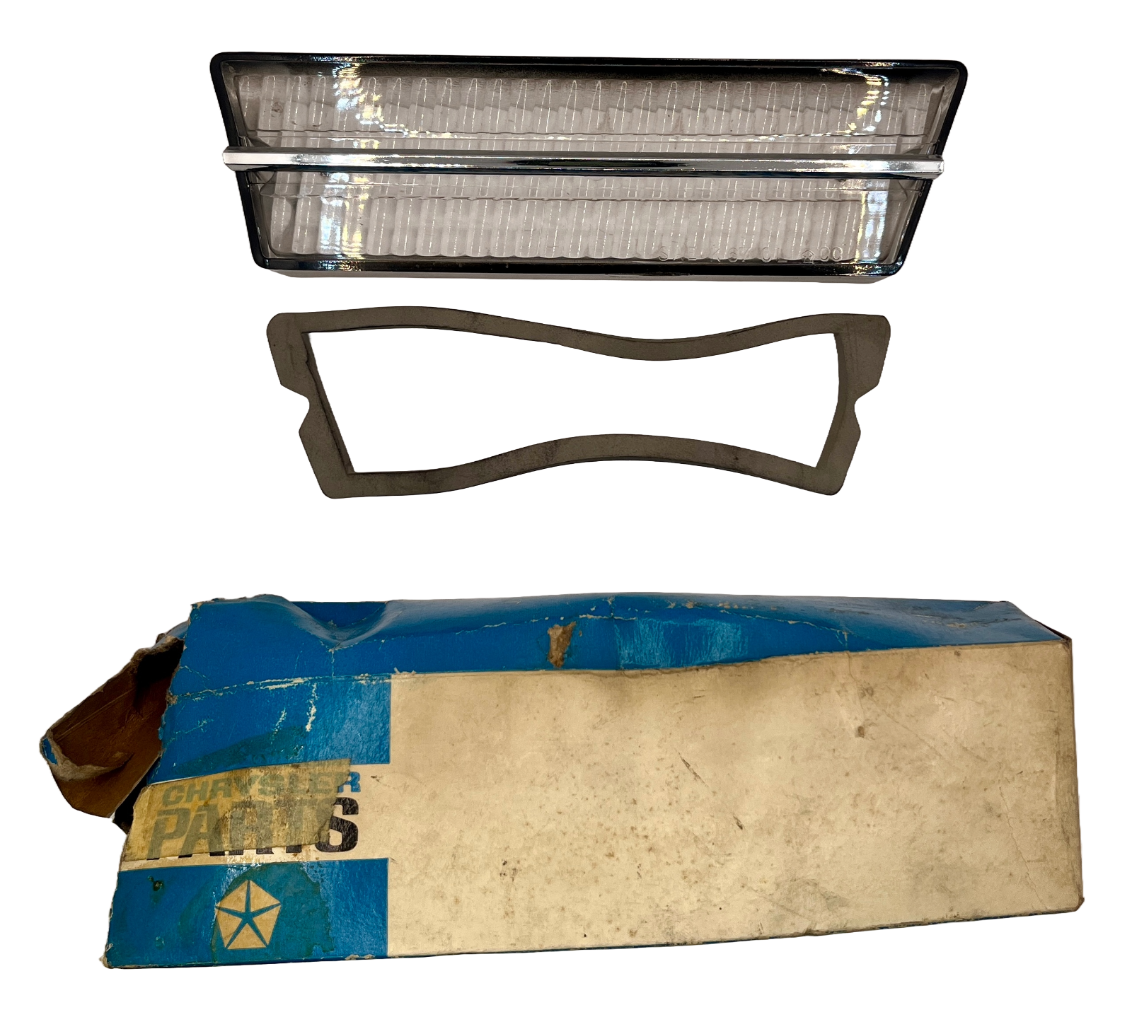 This is a New Old Stock fender end corner parking and turn signal lamp lens for all of the models listed below. Original Chrysler part in original packaging. Includes gasket.